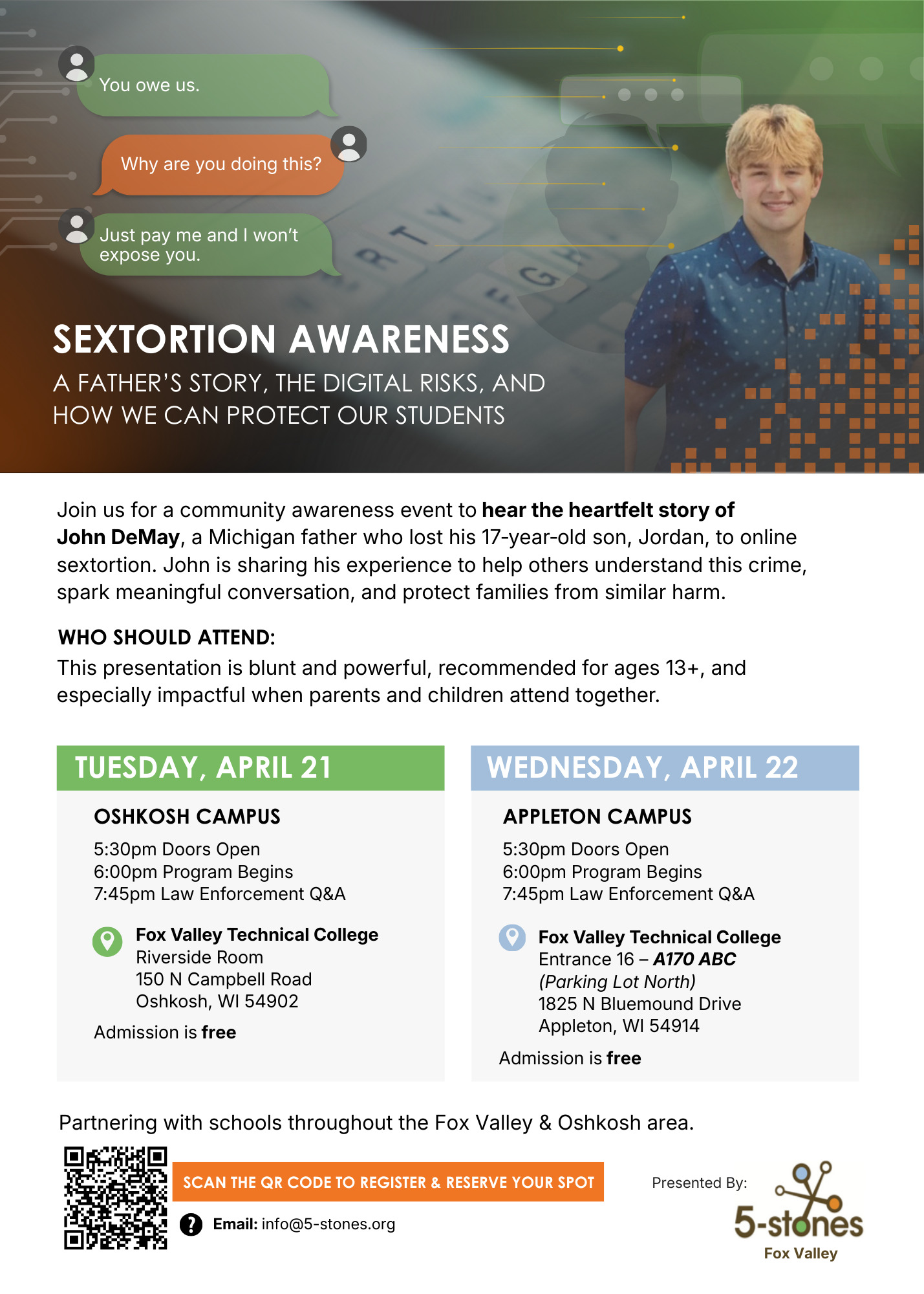 We are also hosting a SEXTORTION AWARENESS presentation on Tuesday, April 21st, at Fox Valley Technical College in Oshkosh, and again on Wednesday, April 22nd, at Fox Valley Technical College in Appleton. Admission is FREE, but registration is required.